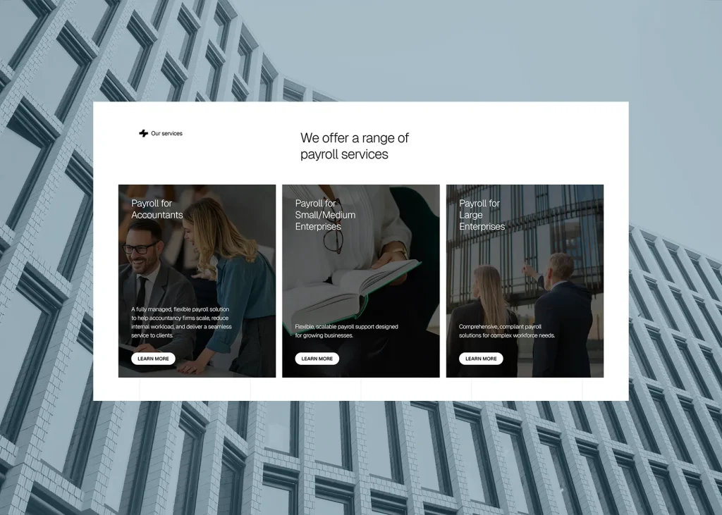 The site showcases Qualitas Payroll’s comprehensive service offering across three key audiences: accountants, SMEs, and large enterprises. Each pathway is tailored to address specific pain points and business needs, making it easy for potential clients to find exactly what they’re looking for.